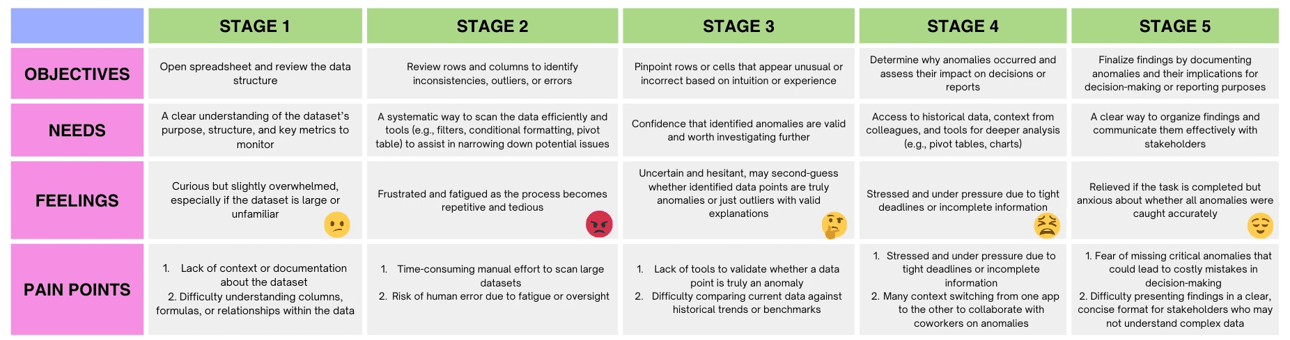 We created a user journey map to visualize Paul's current process, highlighting his feelings of being overwhelmed, frustrated, and uncertain at various stages of finding an anomaly. This helped us pinpoint the exact moments where our tool could provide the most value.