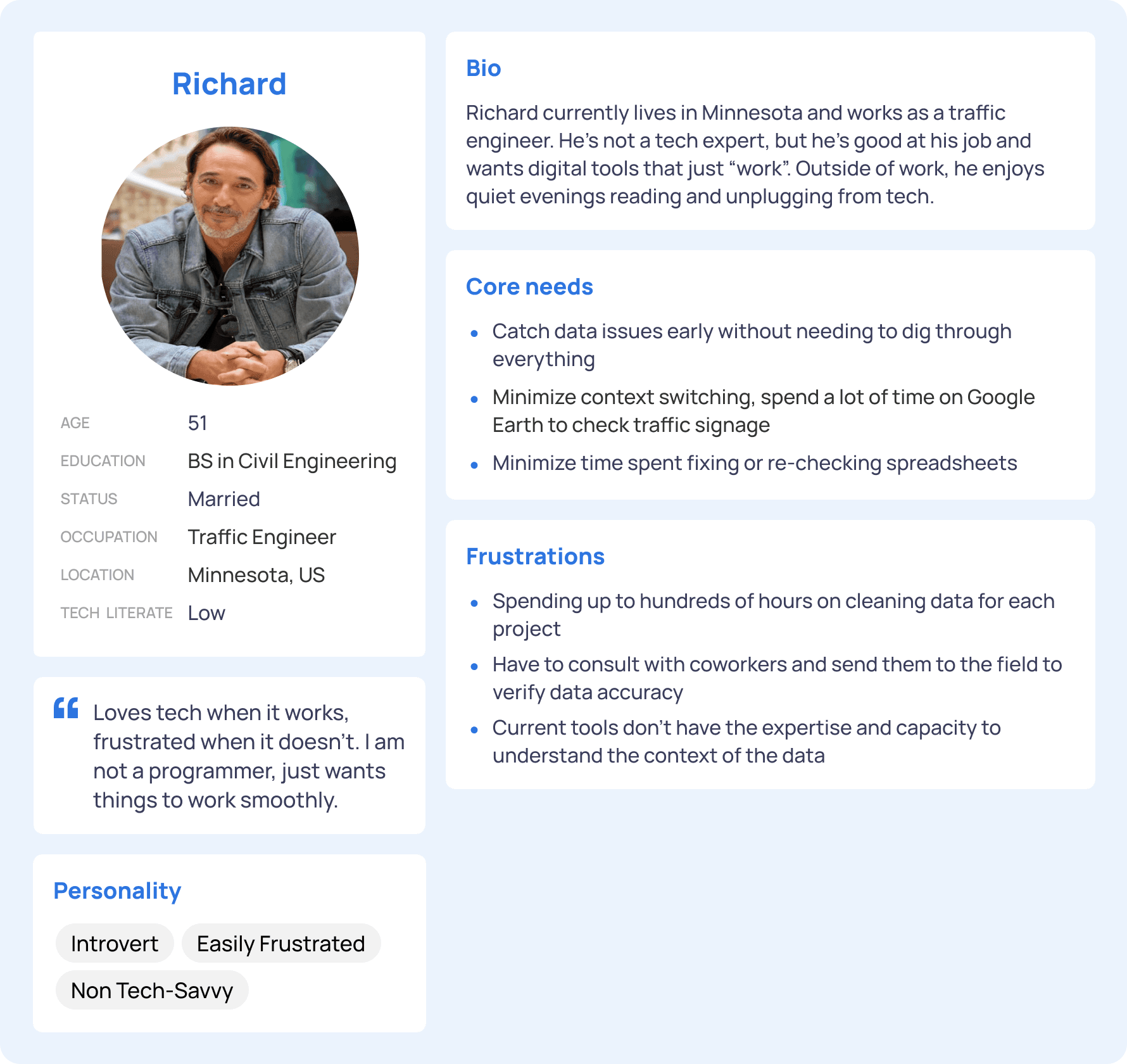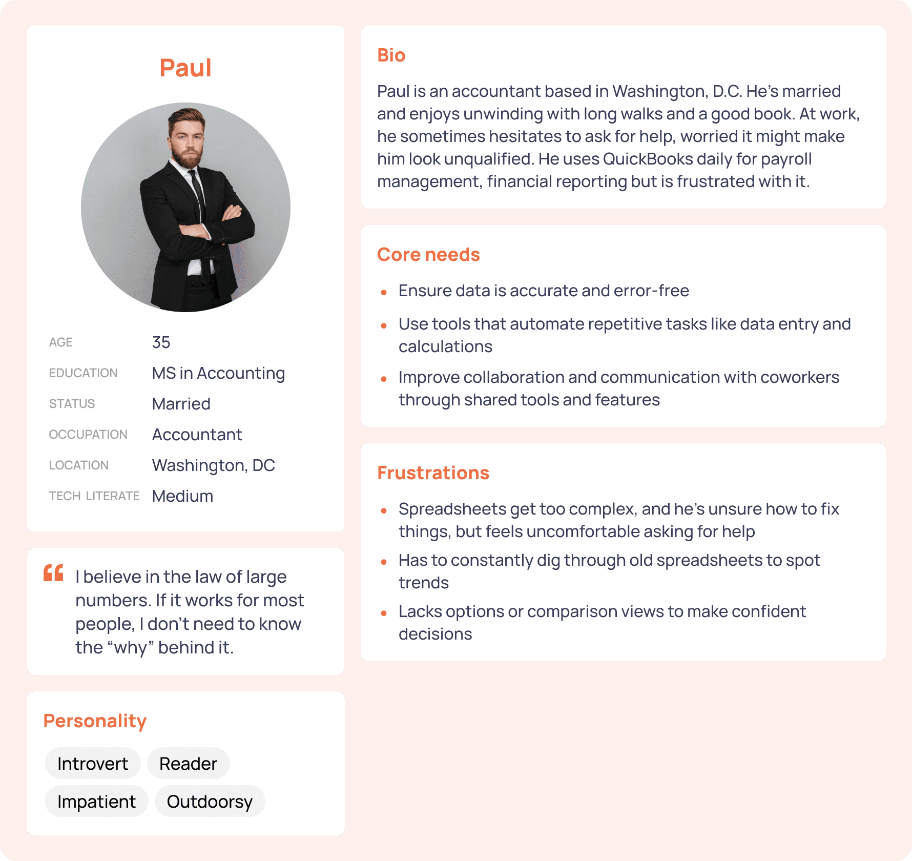 We synthesized our findings using an affinity diagram. This led to the creation of three distinct user personas—Sarah (the expert), Paul (the intermediate user), and Richard (the non-technical user)—to represent the diverse needs of our audience. We chose to focus our design on "Paul," the accountant who is proficient with spreadsheets but feels uncomfortable asking for help and gets overwhelmed by complex tools.